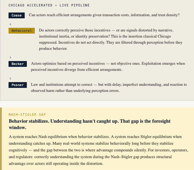 Vision Functions operate as a causal routing system — classifying environments into dominant causal categories before any simulation runs. Rather than assuming every environment is strategy-driven, they select the governing mechanism so prediction reflects how the system actually operates. Chicago Accelerated governs how systems move. Nash–Stigler governs when they are miscalibrated.