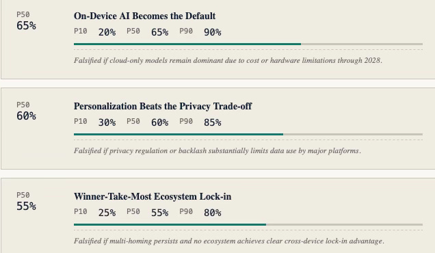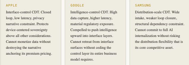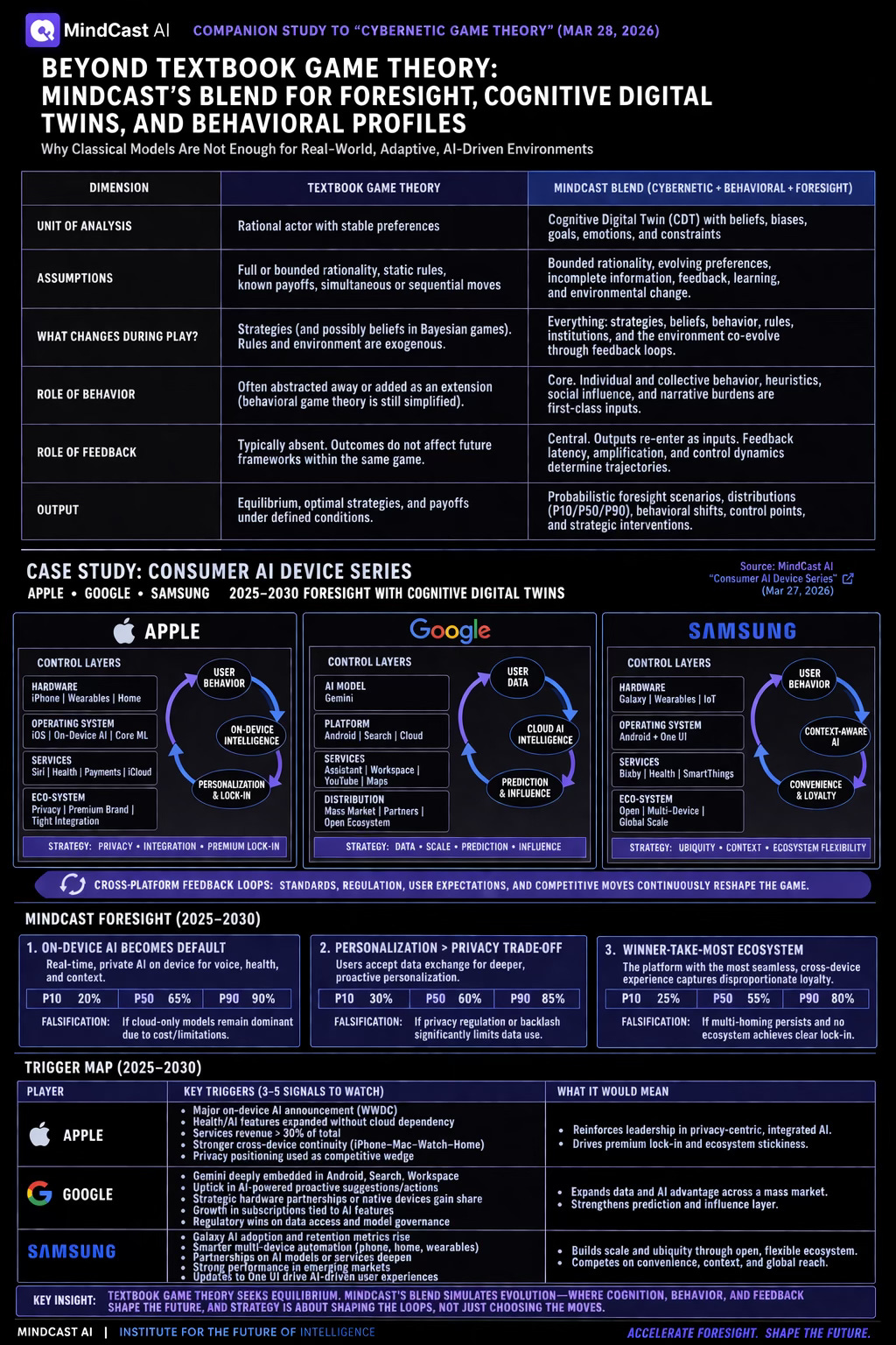 Running both frameworks on the same field — Apple, Google, and Samsung competing across interface, intelligence, and distribution layers — makes the structural difference concrete. Classical game theory produces conditional equilibrium ranges. MindCast produces CDT profiles, P10/P50/P90 scenario bands, trigger maps, and falsification conditions. Cybernetic Overview of The MindCast Consumer AI Device Series