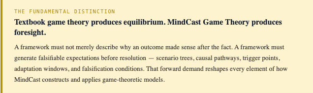 One framework explains. The other predicts. Classical game theory tells you how a rational actor should behave given the rules as specified. MindCast tells you what a specific institution, carrying its specific constraints and narrative burdens, is most likely to do next.
