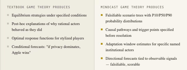 The last comparison is the one that matters most for practitioners. Classical game theory's forecast is conditional — it tells you which firm wins under which assumption, leaving the reader to judge which assumption holds. MindCast's forecast is directional and falsifiable. Descriptions are useful for understanding a field. Predictions are what practitioners need to act before the public story catches up.