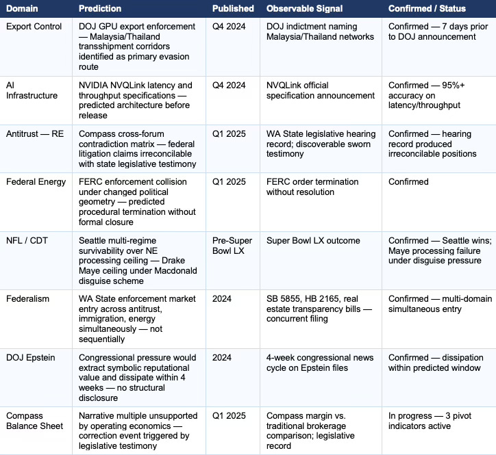 Football is the proof environment, not the product. The governing observation: the same CDT architecture that predicted Seattle’s multi-regime survivability over New England’s processing ceiling has produced 29 discrete pre-committed predictions across six domains — NFL, antitrust litigation, complex commercial litigation, export control enforcement, AI infrastructure technology, and federal energy regulation — with zero structural misses. The validation record is not a track record in the sports-betting sense. It is external confirmation that the dominance-testing protocol generates reliable causal identification under stress conditions.
