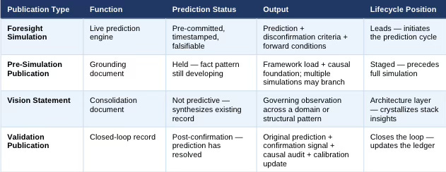 Consolidation documents. Insights from across the stack are synthesized into a governing observation about a domain, an institution, or a structural pattern. Not predictive in the forward-condition sense — Vision Statements crystallize what the simulations have revealed at a point in time. Architecture documentation rather than live fire.