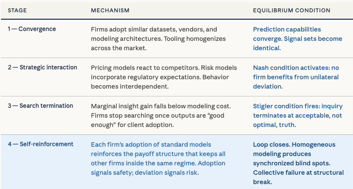 The equilibrium is self-reinforcing in the precise cybernetic sense. Each firm’s adoption of standard predictive models reinforces the payoff structure that keeps all other firms inside the same modeling regime. Adoption signals safety; deviation signals risk. The loop closes. New entrants observe the stable payoff structure and adopt the same tools, deepening the equilibrium with each cycle. The system does not drift toward the accurate model — it drifts away from it, because accuracy under structural instability requires the very deviation that the equilibrium penalizes.