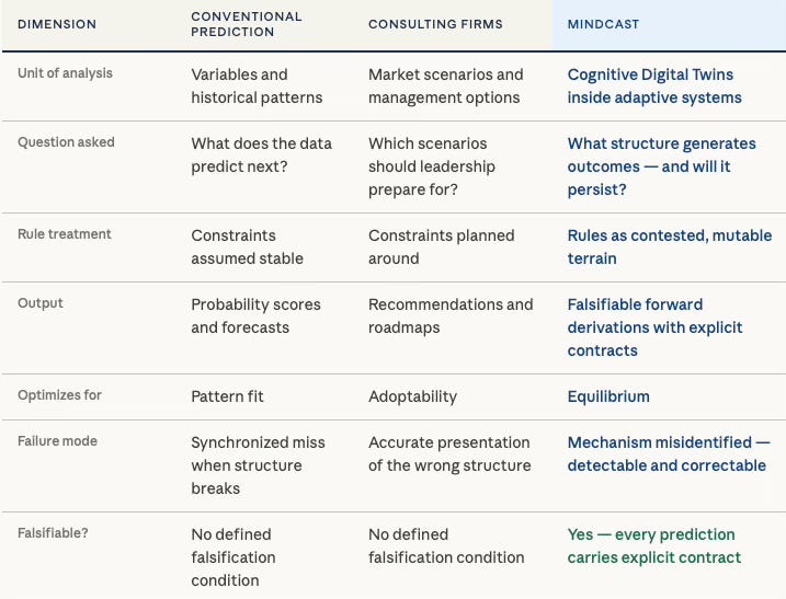 MindCast departs at the level of the question asked. Conventional prediction asks what the data suggests will happen next. MindCast asks what structure is generating outcomes — and whether that structure will persist. The analytical unit shifts from variable to mechanism, and from probability to constrained necessity. A variable can be measured. A mechanism must be identified, mapped, and tested against the adaptive behavior of the actors it governs. Those are different intellectual operations, and they require different architecture.