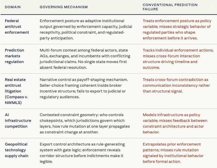 The same structural logic governs all four domains. Antitrust enforcement, prediction markets regulation, real estate litigation, and AI infrastructure competition are not analytically separate problems that happen to share surface features. Each is a manifestation of the same underlying system: concentrated actors with asymmetric information and incentive to shape rules, diffuse actors with delayed coordination capacity, institutions that function as rule-generating feedback systems rather than neutral referees, and narrative control as the mechanism by which constraint geometry is contested before it is formally codified. The Cybernetic Foundations of Predictive Institutional Intelligence: The Architecture of Institutional Foresight maps the theoretical substrate that makes this transfer possible: Ashby’s law of requisite variety establishes the minimum structural complexity a model must carry to govern the system it describes; Beer’s viable system model identifies the feedback layers an institution must maintain to remain adaptive under stress; Wiener’s control theory specifies how loop closure speed determines which actor governs an outcome. These foundations are not decorative. Strip them from the architecture and the cross-domain transfer collapses.