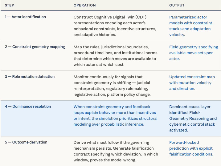 The simulation sequence makes the departure from conventional prediction concrete. Each simulation begins by identifying the actors in the field and constructing Cognitive Digital Twin representations that encode their behavioral constraints, incentive structures, and adaptive histories. The simulation then maps the constraint geometry — the rules, jurisdictional boundaries, procedural timelines, and institutional norms that determine which moves are available to which actors at which cost.