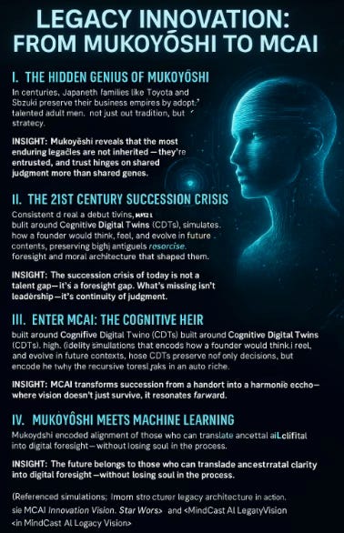 Just as a mukoyōshi was chosen for his ability to uphold and evolve a legacy, MCAI can be trained on the recursive memory of a founder—becoming an adaptive steward that refines its insight across changing environments. For families, this means multi-generational continuity. For companies, it means cultural resilience. For civilizations, it means foresight that is structured and shareable.