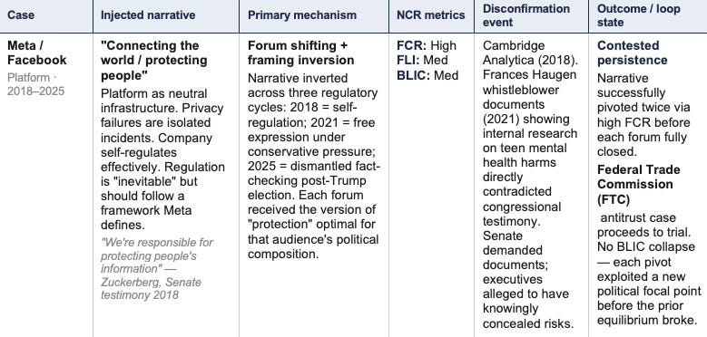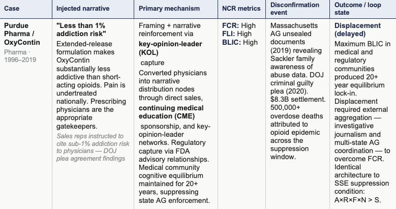 Three patterns emerge across the cases. First, high BLIC is the dominant predictor of equilibrium persistence duration — cases with maximum BLIC (Boeing, Purdue) produced the longest lock-in periods, with Purdue sustaining cognitive equilibrium for over two decades through physician network capture. Second, high FCR without high FLI produces the most durable narrative architectures — Meta’s ability to pivot the focal narrative across three distinct political audiences before each forum fully closed reflects maximum FCR operating under manageable latency conditions. Third, displacement consistently requires external aggregation when internal FCR remains high — neither Boeing nor Purdue experienced displacement through normal institutional channels; both required an exogenous aggregation event (a second crash; multi-state attorney general (AG) document unsealing) to break cognitive equilibrium simultaneously across the actor network — a pattern SSE’s prediction anticipates directly: signal suppression in high-access-dependence networks cannot be broken from within.
