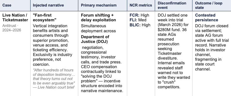 In NCR terms, Layer 2 is the narrative signal N(t). Layer 3 is the multi-forum deployment architecture that exploits FLI differentials. Layer 1 is the revenue mechanism the narrative protects. The system holds as long as the four forum audiences do not compare notes — precisely the audience-separation condition NCR’s competitive displacement framework identifies as the structural vulnerability.