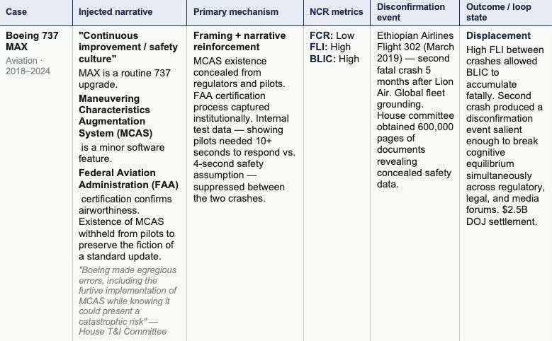NCR’s architecture is domain-independent. The same loop mechanics — narrative injection, belief updating, equilibrium selection, feedback dynamics, and lock-in — operate across antitrust enforcement, aviation safety regulation, platform governance, and pharmaceutical distribution. The four cases below demonstrate the framework’s applicability across industries and institutional contexts, mapping each case to specific NCR mechanisms and observed metric signatures.