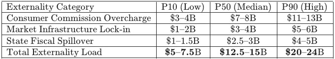 Methods Note: P10/P50/P90 bands reflect conservative, median, and high-harm parameterizations over a five-year horizon. The simulation reports externality load as the delta between (i) credible structural enforcement and (ii) procedural termination without structural correction. Bands do not predict settlement terms; they price the harm retained under each enforcement equilibrium.