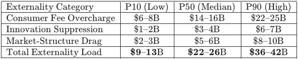 In standard economic analysis, externalities are costs imposed on third parties outside a transaction. Under the current enforcement equilibrium, consumers and competitive markets—the intended beneficiaries of antitrust law—have become the third parties bearing uncompensated costs while regulated firms and agencies reach procedural closure.