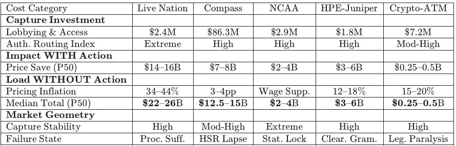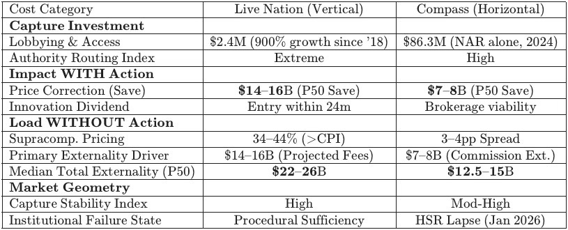 Mapping counterfactual deltas across enforcement regimes provides a standardized input surface for Cognitive Digital Twin (CDT) flows. Each data point anchors the “Stiglerian Subsidy”—the investment in access arbitrage—to realized market foreclosure. Focusing the primary analysis on Live Nation and Compass-Anywhere establishes the predictive power of the model across both vertical and horizontal concentration geometries.