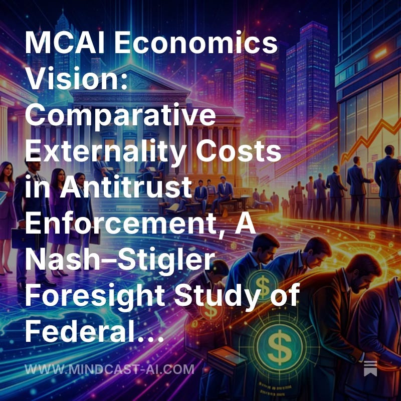 Foundational MindCast AI publications provide the operative logic for the current foresight simulation by defining the parameters of capture and termination rules. Published frameworks establish the terminal constraints for any foresight simulation, proving that current DOJ “stability” is actually a transfer of unpriced externalities to the public. Utilizing these antecedents provides the empirical and theoretical weight necessary to challenge prevailing federal enforcement orthodoxy.