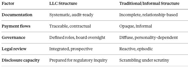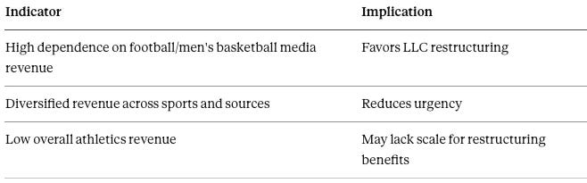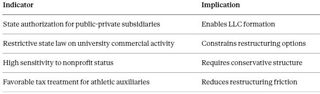 By separating athletics economics from university balance sheets, schools isolate NIL monetization, labor exposure, and antitrust risk inside an athletics-affiliated LLC. The entity becomes the locus of revenue control, capital discipline, and compliance infrastructure—functioning as the economic firm even if formal classifications remain unchanged.
