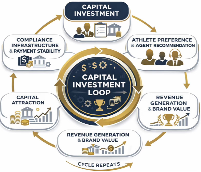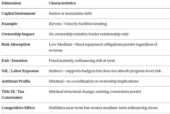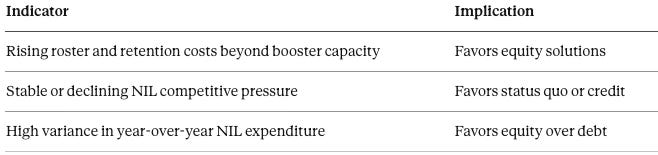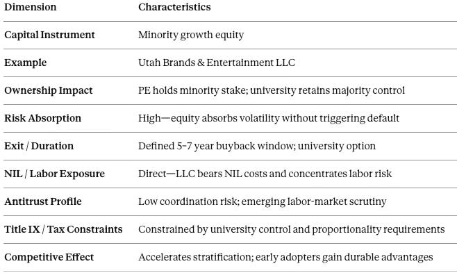 Minority equity capital → volatility absorption (NIL + roster + settlement)