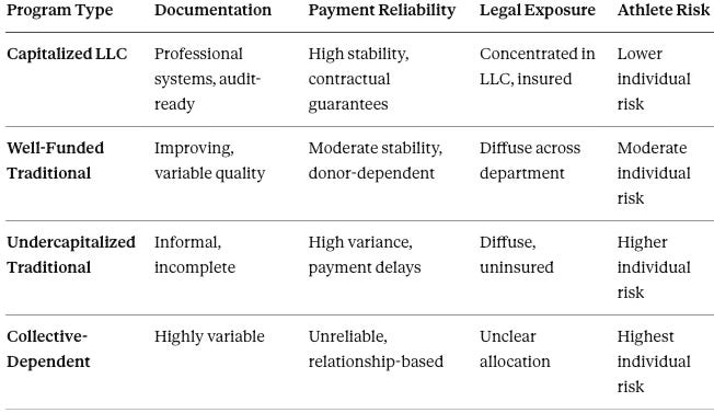 Equity-backed programs can fund documentation systems, legal compliance, and payment stability. Undercapitalized programs rely on informal arrangements, exposing athletes to higher individual risk even when nominal compensation is comparable.