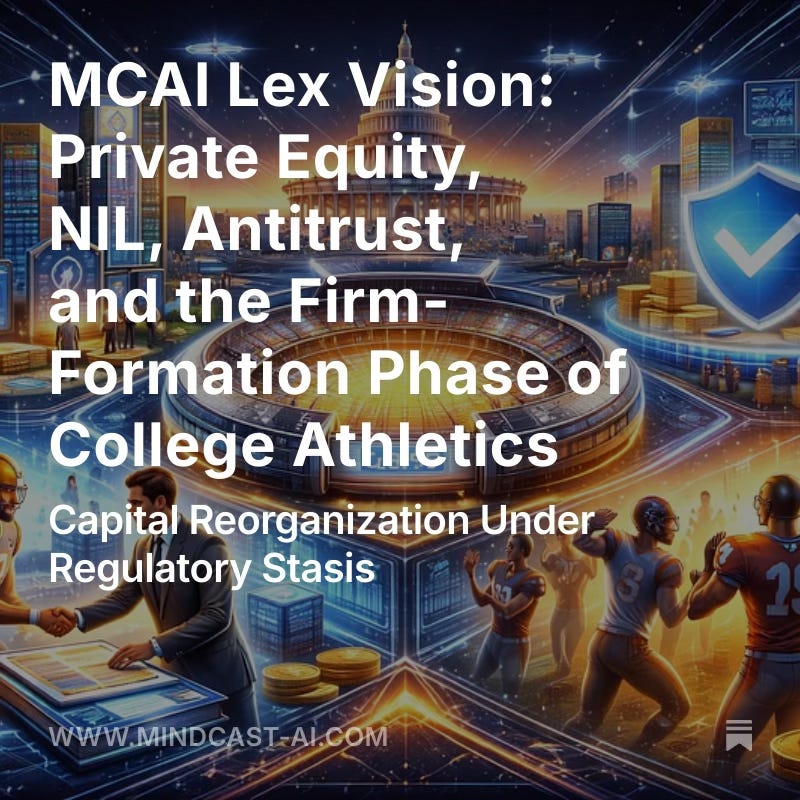 Contact mcai@mindcast-ai.com to partner with us on NCAA NIL foresight situations. See also MCAI Economics Vision: Chicago School Accelerated — Integrated Application, the NCAA NIL Interregnum (December 2025), MCAI Lex Vision: SAFE vs. SCORE Act — Which Path Should Define NCAA NIL? (September 2025), MCAI Lex Vision: How the SCORE Act Codifies College Sports Inequality (August 2025).