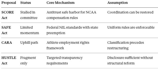 Asset partitioning and capital entry are accelerating precisely because the traditional source of governance—federal legislation—has failed to materialize. Proposed NIL and antitrust legislation assumes coordination can be restored just as institutions are abandoning coordination in favor of firm-level restructuring. Congressional proposals focus on safe harbors for collective rules on compensation and eligibility.
