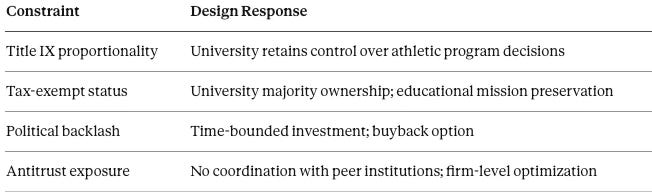 Becker: Schools re-optimize around the new incentive structure. Capital stack arbitrage—choosing equity over debt, LLC over department—becomes the rational response to regulatory ambiguity.