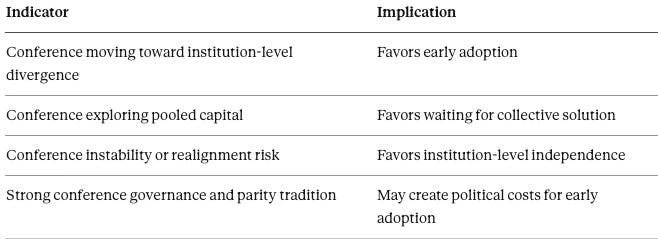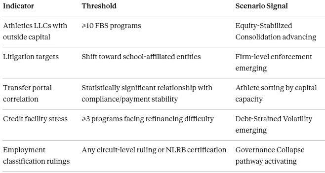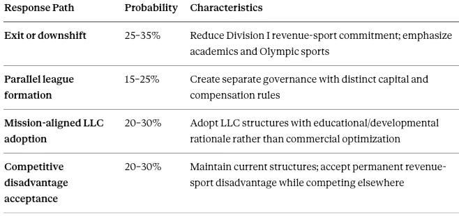 Foresight Prediction (from CSI): By T+36 months: ≥10 programs adopt athletics LLC structures; ≥3–5 experiment with minority-equity variants.