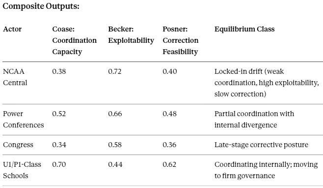 Coase: Coordination capacity collapses when the focal point (NCAA/Congress) loses legitimacy. Transaction costs of inter-institutional agreement now exceed the costs of firm-level optimization.