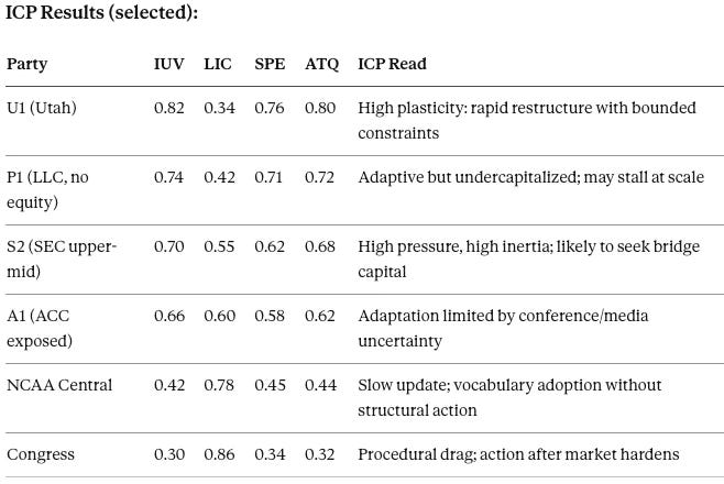 Narrative Interpretation: ICP predicts institutional update velocity concentrates at the school level, not at NCAA or Congress. Programs with LLC scaffolding can prune legacy constraints; coordination bodies cannot.