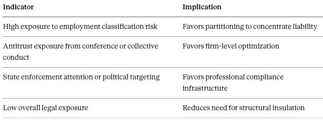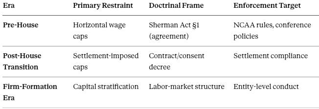 As coordination collapses and firm-formation proceeds, antitrust exposure migrates from familiar territory—horizontal wage restraints—toward less charted ground. Post-House antitrust risk migrates from horizontal wage restraints to vertical capital stratification that produces durable competitive and labor-market asymmetries without explicit collusion.