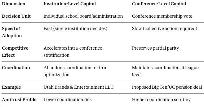 Sophisticated athletes (and agents) increasingly recognize this trade-off. The transfer portal enables arbitrage: athletes can move toward stability as their risk preferences and information improve. Capital architecture quietly governs athlete experience long before formal labor rules are written.