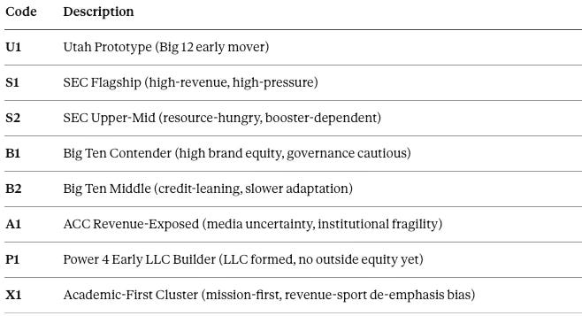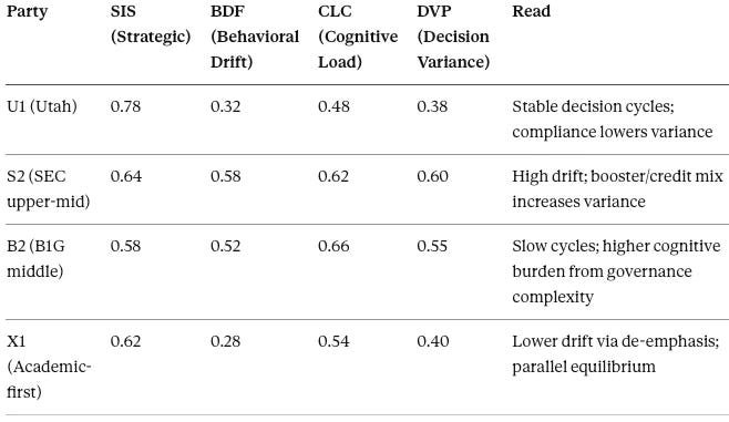 Institutional CDTs were parameterized using governance structure, revenue exposure, access to capital, legal constraints such as Title IX of the Education Amendments of 1972 and nonprofit tax posture, and demonstrated adaptation speed. Regulatory and legislative CDTs were parameterized around enforcement delay, procedural inertia, and public narrative signaling. Athlete labor markets were modeled as buyer–seller systems with differentiated risk tolerance, information asymmetry, and transfer optionality. Beyond Utah as the prototype adopter, the simulation modeled early adopters with existing commercial-entity scaffolding, credit-reliant programs, conference-level pooling pathways, and academic-first institutions as parallel equilibria.