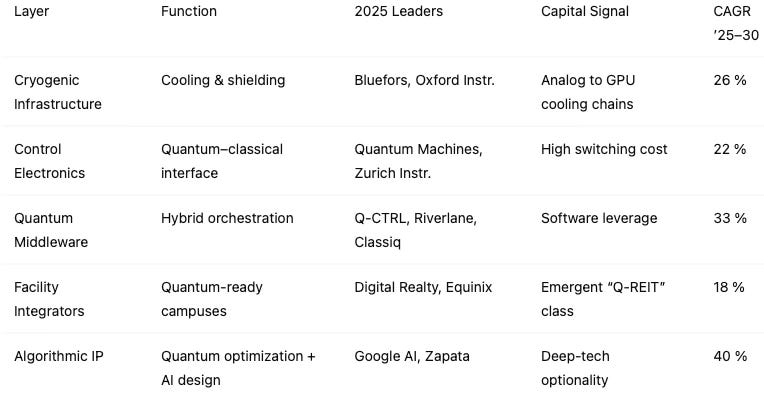 The quantum–AI stack creates five investable layers, each echoing how GPUs, networks, and cloud software became asset classes. What matters is not raw qubit count but interface control—the ability to translate coherence into cash flow.