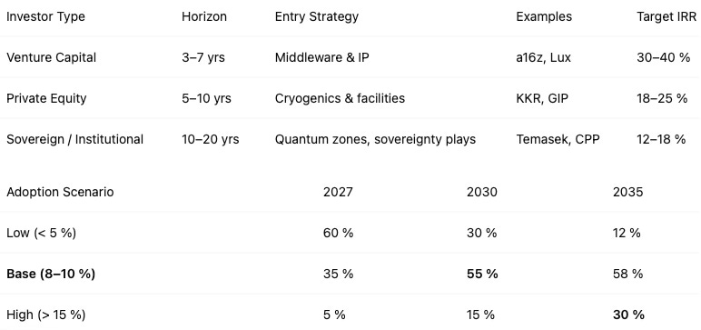 By 2030 base case, hybrid cap-ex 8–10 % delivers 14–18 % IRR; by 2035, 12–15 % cap-ex share returns 20 % +. The Nobel laureates supplied the physics; investors supply the permanence. Those who align capital with coherence economics will own the bridge between energy, computation, and decision quality.