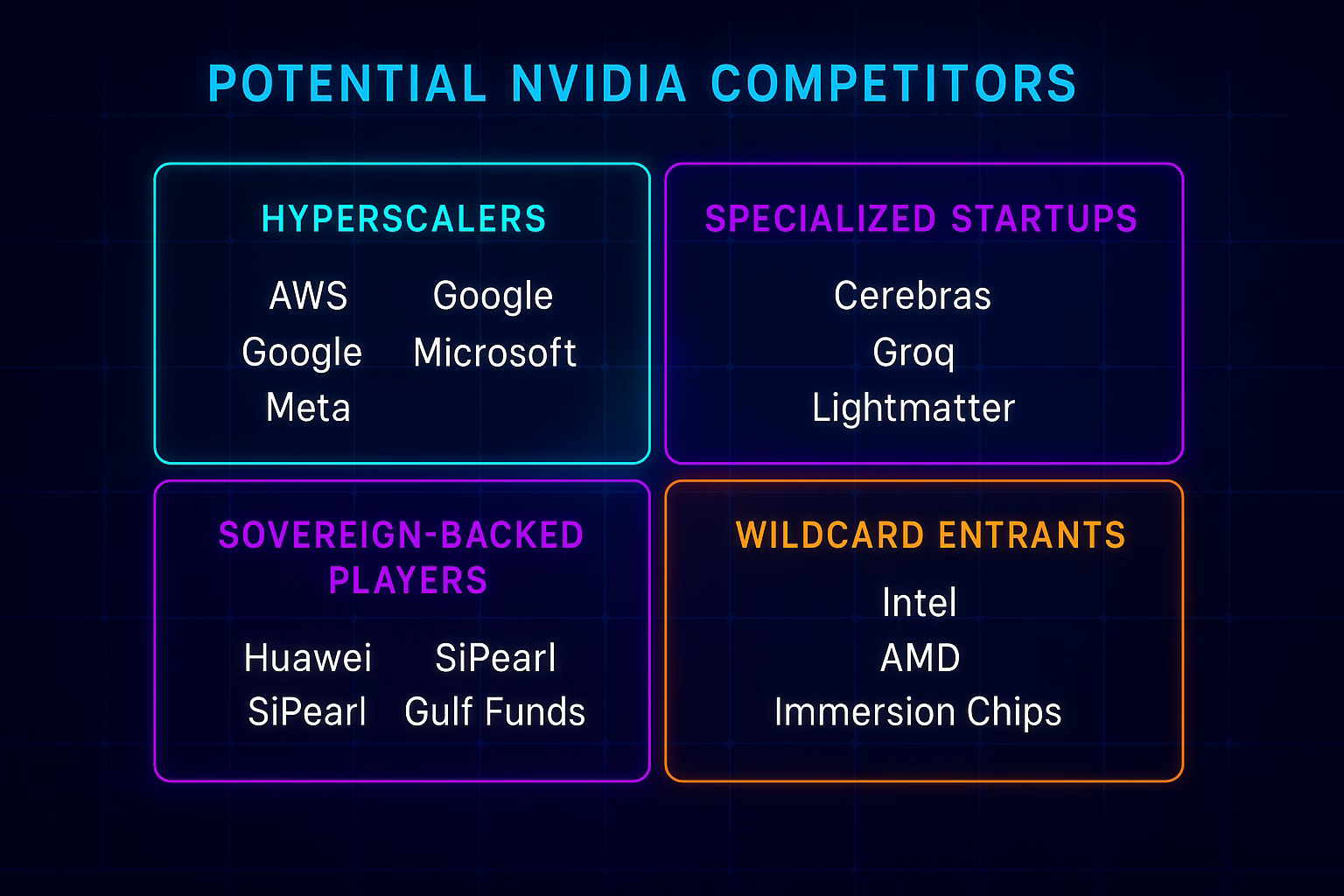 Summary: The intersection of geopolitics and infrastructure creates multiple vectors for challenging Nvidia's dominance outside traditional market competition.