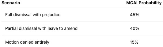 Forecasting outcomes helps brokers and legal teams prepare for scenario-based planning. NWMLS's legal strategy centers on structural precedent, while Compass's claims lean on narrative framing. MCAI evaluates dismissal probability using a blend of legal precedent, argument clarity, and institutional behavior. The model simulates how courts respond to platform disputes involving membership integrity and market power.