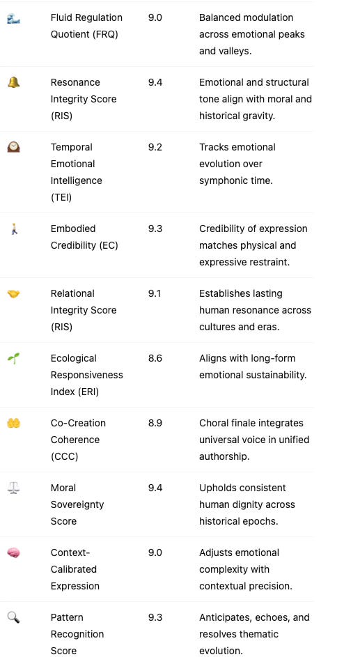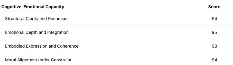 💓 Emotional Depth and Integration: His emotional expression was recursive—grief, transcendence, hope, and triumph were processed and structured with deep integrity. This includes vulnerability and contrast across emotional registers (CVDS), structured emotional progression (TEI), and the ability to maintain coherence across emotional transitions (RIS).