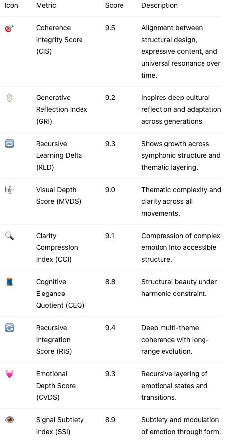 🎼 Structural Clarity and Coherence: He orchestrated in silence through layered pattern integration, structural recursion, and thematic symmetry—turning thought into symphony. This capacity reflects how thematic complexity is maintained across movements (MVDS), tension and resolution are balanced (CEQ), and smaller musical motifs are synthesized into higher-order meaning (RIS).