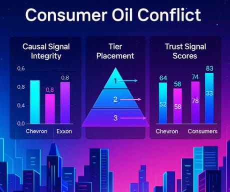 MindCast AI forecasts this hybrid resolution as the most foresight-aligned outcome. MCAI’s MAP CDT Flow simulations show that this approach preserves both economic velocity and legal accountability. Chevron operates in Tier 2–3, strong on investor foresight but legally vulnerable. Exxon holds Tier 2 positioning—strong procedural coherence but with potential reputational friction. Consumers remain underrepresented but emerge as the group most aligned with systemic equilibrium. MCAI activates Trust Vision, Legal Vision, and Causation Vision simultaneously to project the trust delta under each outcome. It finds that structural fairness—not speed or control alone—produces the highest trust signal across all tiers.