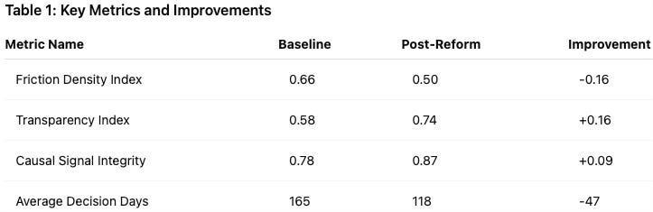 Friction can be measured. FDI, TI, and CSI convert governance quality into metrics. Performance becomes visible.