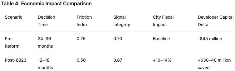 Each month of delay costs roughly 95 basis points in capital and $2 million in carrying costs. Bellevue’s 18-month delay on the North segment caused $38–46 million in net present value loss and $8 million in delayed tax inflow. With Ordinance 6823, reduced friction and faster approvals decrease friction spread by 60%. Time, quantified as liquidity, becomes a governance variable.