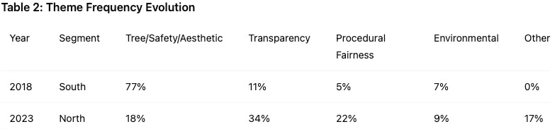Across 400 pages of comments, residents and stakeholder groups displayed an evolving tone and focus. Early in the Energize Eastside cycle (2018–2019), concerns focused on environmental effects, tree loss, and aesthetics—language typical of neighborhood preservation. As the process extended, “transparency,” “process,” and “accountability” became dominant. By 2021–2023, nearly two-thirds of submissions referenced procedural fairness or access to information. Prolonged timelines and inconsistent communication transformed substantive debate into procedural distrust.
