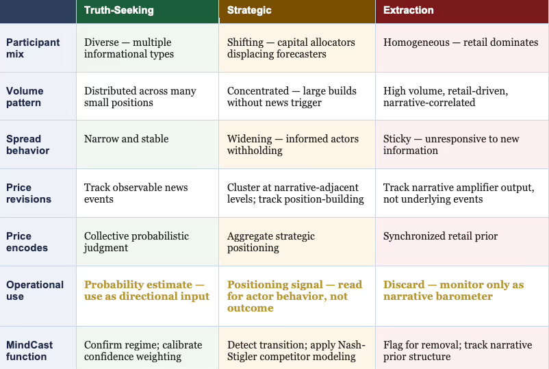 Operationally: prices are discard signals. Remove extraction-regime platforms from analytical input sets. Monitor them only as narrative barometers — indicators of what the retail belief environment currently reflects, useful as context for understanding the prior structure of a broader population, but carrying no informational content about the underlying event being priced.