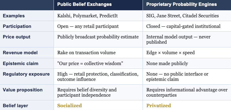 The distinction is precise: public prediction markets socialize the belief layer. Proprietary probability pricing privatizes it. Both produce probability estimates. One monetizes by charging for access to the aggregation process and broadcasting the output as a public epistemic good. The other monetizes by keeping the output private and systematically trading against those who lack it.