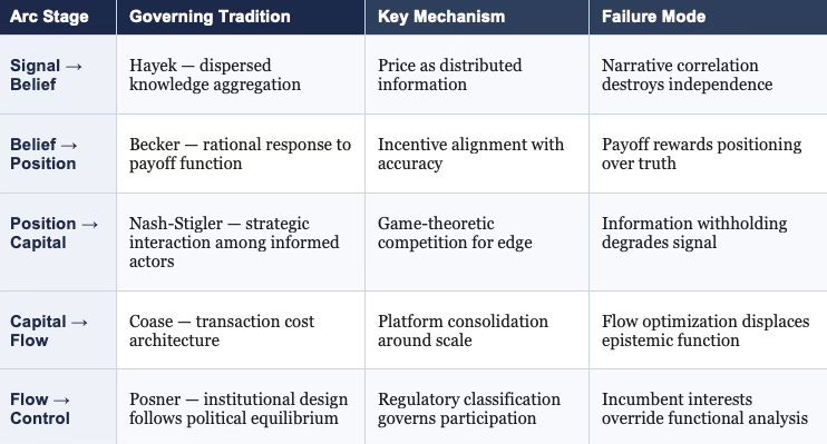 Each stage of the arc operates under a distinct governing economic logic. Hayek governs the signal-to-belief transformation: signals carry dispersed local knowledge, and the aggregation mechanism at the belief layer is the Hayekian price system applied to probability rather than to resource allocation. Becker governs the belief-to-position transition: actors respond to the payoff function the market actually offers, not to the epistemic function it claims to serve, and once that payoff function rewards strategic positioning over honest belief expression, Beckerian rational choice predicts the transition from truth-seeking to strategic behavior.