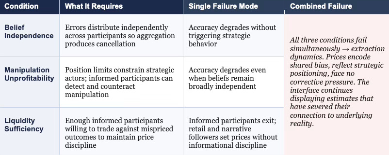 Prediction markets sustain truth-generating behavior only when three conditions hold simultaneously. Participant beliefs must remain sufficiently independent that aggregation produces cancellation rather than amplification of errors. Manipulation must remain unprofitable — either because position limits constrain strategic actors or because informed participants can reliably detect and counteract manipulation. Liquidity must remain sufficient to attract genuinely informed participants willing to trade against mispriced outcomes.