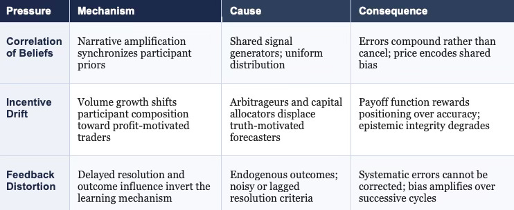 Incentive drift, belief correlation, and feedback distortion do not require bad actors or deliberate manipulation to move a prediction market out of truth-seeking behavior. Each force operates through individually rational decisions that aggregate into systemic degradation — which is why they are difficult to detect from inside the market and why identifying them requires the external vantage point the arc framework provides.