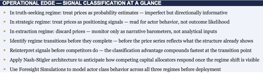 Operationally: prices become adversarial signals. Read them for positioning intelligence — who is building exposure, in which direction, and at what velocity — not as forward probability estimates. Strategic regime prices are informative about actor behavior, not outcome likelihood. A capital allocator who continues treating these prices as probability estimates after the regime shift is transferring information advantage to the actors who moved first.
