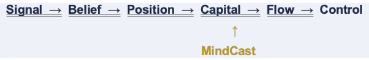 Three functions define the cartographer role. MindCast maps how signals become beliefs — tracing the pathway from raw information production through narrative amplification and into aggregated probability estimates, identifying where correlation, distortion, and strategic manipulation enter the signal chain. MindCast models how beliefs convert into positions — analyzing the incentive structures that govern position-taking behavior across actor classes, and identifying when belief market logic is giving way to capital market logic within a given platform or participant population. MindCast tracks how positions scale into capital and flow — measuring the downstream consequences of regime transitions for capital allocation and platform behavior.