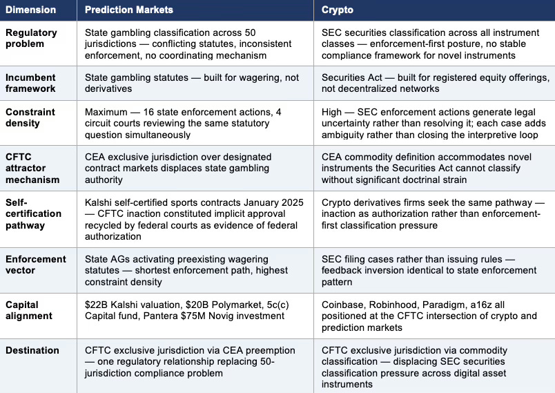 Crypto reached the same field geometry through a different instrument pathway. The SEC’s assertion of securities classification over digital assets created the same fifty-jurisdiction compliance problem — not through state enforcement, but through federal over-classification that applied a regulatory framework built for equity securities to instruments that do not fit the Howey test, the Supreme Court standard for determining whether something qualifies as a security, without significant doctrinal strain. Crypto firms have spent a decade pushing toward CFTC jurisdiction precisely because the CEA’s definition of commodity accommodates novel instruments more naturally than the Securities Act’s definition of security accommodates decentralized networks. The field geometry is identical: high constraint density under the incumbent regulatory framework, one low-friction attractor available at the CFTC, and firms migrating toward it regardless of individual strategic preference because the field makes any other path more costly.