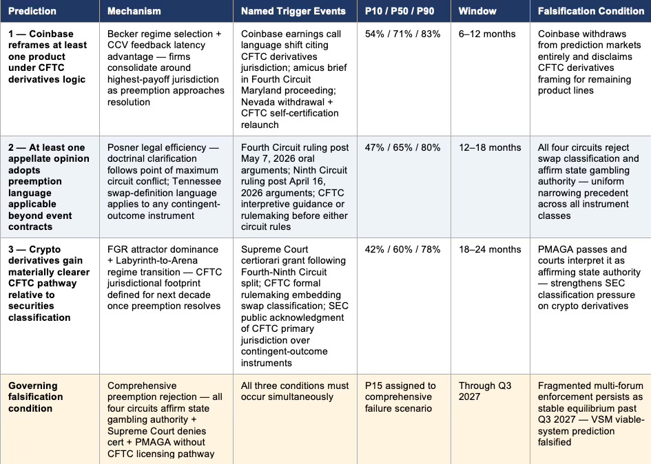 Three forward predictions follow from the framework stack. Within six to twelve months, Coinbase explicitly reframes at least one product under CFTC derivatives logic — a Becker-predicted output of regime selection maximizing expected regulatory payoff. Within twelve to eighteen months, at least one federal appellate opinion adopts preemption language broad enough to apply beyond event contracts to digital asset instruments — the Posnerian legal system adaptation the circuit split is now producing. Within eighteen to twenty-four months, crypto derivatives gain a materially clearer CFTC pathway relative to securities classification — the FGR attractor dominance outcome once the Kalshi litigation forces a definitive classification ruling. The single falsification condition: courts reject preemption across the board and affirm state classification authority, leaving fragmentation as the durable equilibrium and blocking the CFTC migration for all instrument classes simultaneously.