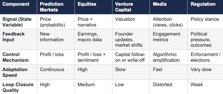 Cybernetic control analysis evaluates feedback capture, adaptation speed, and loop closure across systems. Prediction markets exhibit continuous signal capture, immediate financial consequence, and rapid behavioral updating — losses enforce correction without institutional intermediation. Equity markets update price signals quickly but allow narrative overlays to distort interpretation, producing partial loop degradation. Venture capital exhibits slow adaptation due to multi-year feedback cycles, allowing mispricing to persist and compound across funding rounds. Media systems capture feedback rapidly but optimize for attention rather than truth, producing a mis-specified control variable where engagement substitutes for accuracy. Regulatory systems display the weakest control structure: long latency, diffuse accountability, and no direct financial cost for miscalibration.
